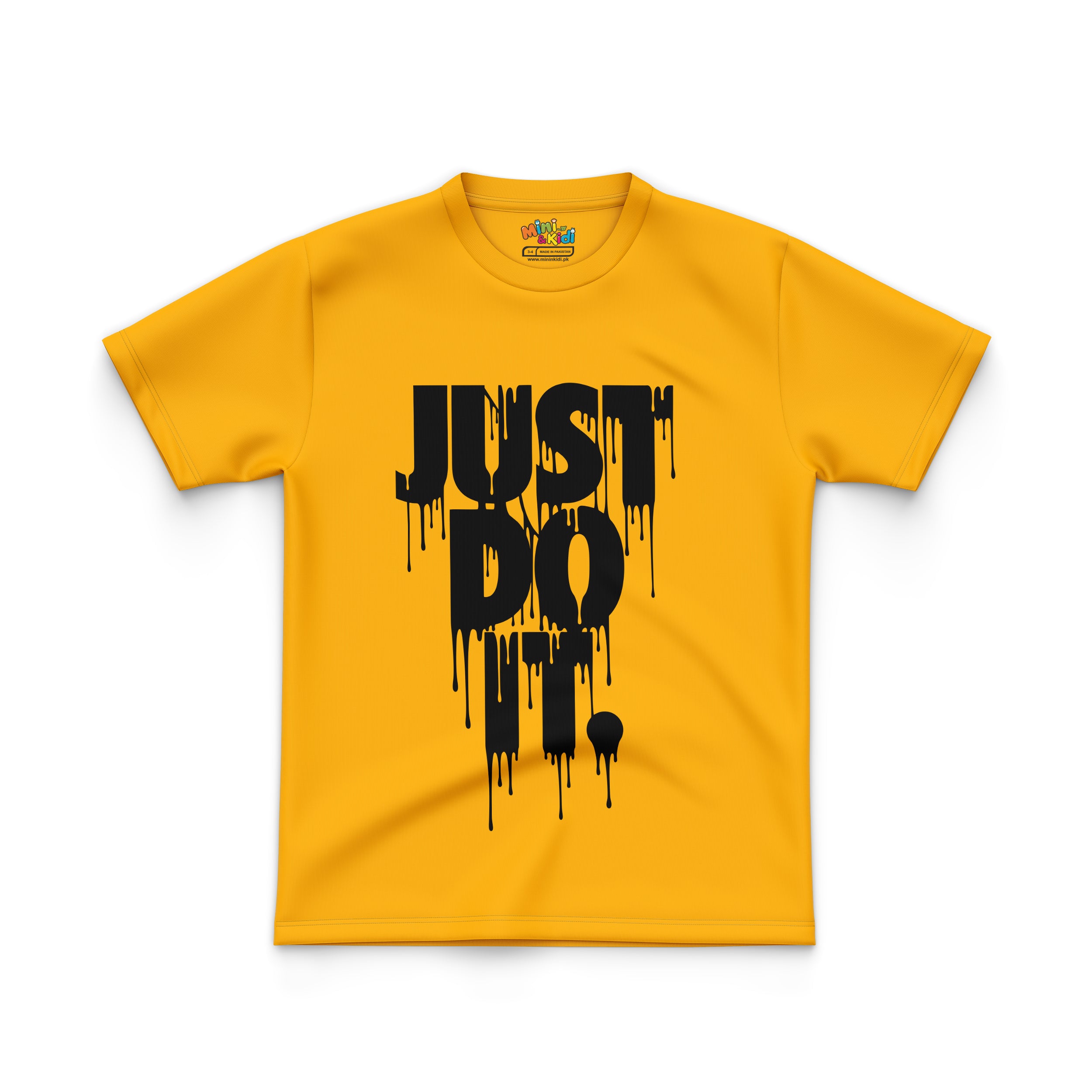 The t-shirt is a crew neck style and features a graphic design on the front. The design says "JUST DO IT" in a bold, black, uppercase sans-serif font. The letters appear to have a dripping effect, as if the paint is melting or running.
