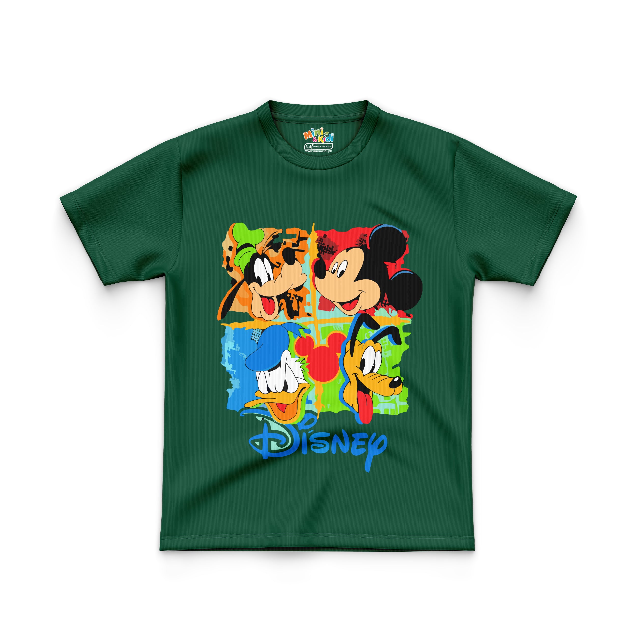 The design is a colorful collage of Mickey Mouse, Donald Duck, Goofy, and Pluto. Each character's face is prominently displayed in a separate section of the collage, set against a vibrant background with a paint-splatter effect.