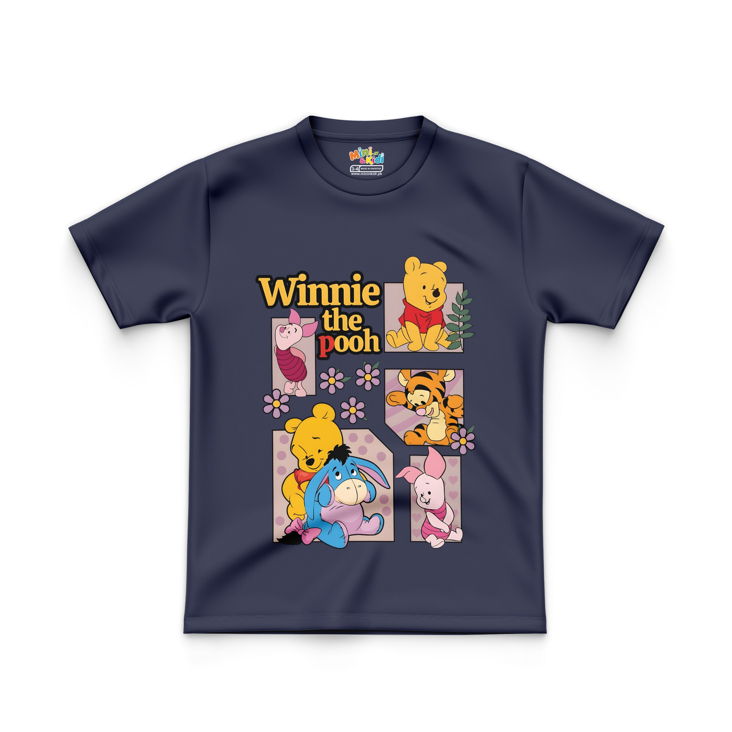 Close-up view of a children's t-shirt featuring a graphic design of Winnie the Pooh and friends. The t-shirt appears to be made of a lightweight cotton material, and the overall aesthetic is bright, cheerful, and aimed at a young audience. The shirt's neckline is a classic crew neck. A small, barely visible tag is visible on the inner neck area.